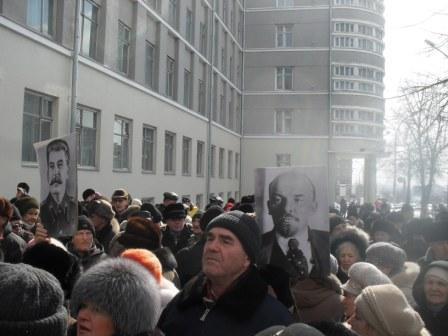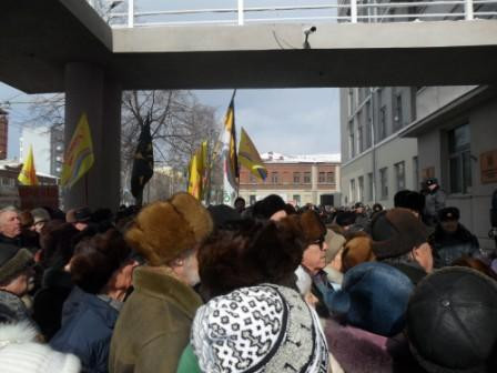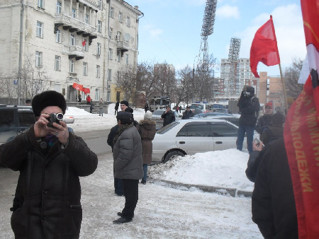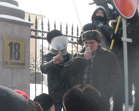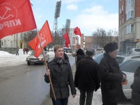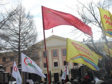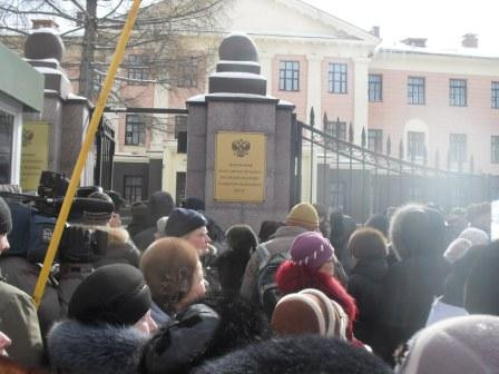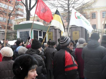 члены КПРФ и СКМ вышли на крыльцо своего здания напротив полпредства (вдалеке)