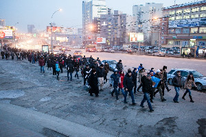 5 марта в Новосибирске по всему городу прошло сразу несколько митингов. Митинг в честь «победы» Путина на выборах, «парад сомнений» от пл. Калинина до пл. Ленина и митинг за честные выборы от ГПНТБ до пл. Ленина. Вокург митингов, полиция поставила ограждения, и стояла у входа с металлоискателями. В 17:30 у ГПНТБ собралось около 600 – 700 митингующих, это значительно меньше ожидаемого. Стоит заметить, что на митинге, за исключением пары человек, полностью отсутствовали члены СР, ЛДПР и «Патриоты России» которые ранее принимали активное участие, и все кричали, что они с народом, и будут поддерживать митингующих. КПРФ тоже не отличилась активностью. Как видимо, после окончания выборов, народ им уже не так нужен. Выступали представители партий и организаций, которые входят в оргкомитет. Одного нашего товарища пытались не допустить до митинга, сказав ему, что распространять агитацию запрещено. Попытка его задержания не увенчалась успехом. И вырвавшись из рук полицаев, перепрыгнув через ограждения, он смог добраться до места проведения митинга.