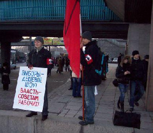 Мы распространяли среди проходящих людей листовки, разоблачающие фальшивые выборы и путинско-медведевскую буржуазную власть. Листовка заканчивалась призывом «Выборы прошли, борьба только начинается!». Также распространялась газета новосибирского АКМ «Красный Реванш». Кроме того, мы скандировали лозунги «Вчера проголосовал, а сегодня хлеб подорожал», «Медведей – в клетку!», «Позор нечестным выборам!», «Власть трудовому народу!».