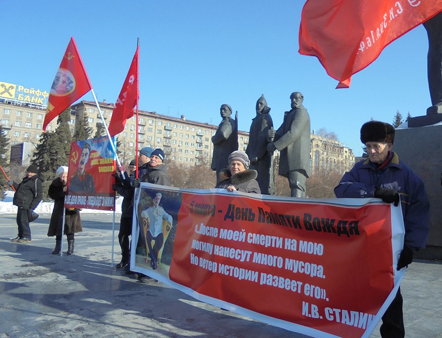 2017-03-05 14:07:25Сегодня, 5 марта, в Новосибирске, на пл. Ленина, у памятника В.И. Ленину, состоялось мероприятие, посвящённое Дню памяти И.В. Сталина. Организаторы мероприятия – ВКПБ, РКРП, Международный союз советских офицеров, ребята из Октябрьского райкома КПРФ, а также наши сторонники и сочувствующие. В мероприятии приняли участие также журналисты телеканала «Красная линия», которые делали репортаж. В сторону Красного проспекта мы развернули красные знамёна, цветные баннеры, портрет И.В. Сталина и растяжку с изображением Генералиссимуса И.В. Сталина: