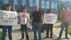 Пикет был организован АК1917 (бывший АКМ). Участники пикета раздавали листовки, в которых требовали освобождения Соколова, Парфенова и Барабаша и прекращения преследования Юрия Мухина. Ниже приводим текст листовки.