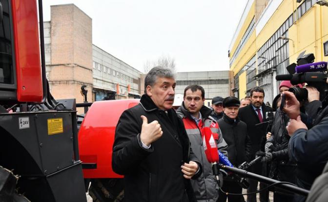 Грудинин во время недавнего визита в Питер посетил Кировский завод, встретился с рабочими тракторного производства и даже сам сделал несколько кругов по заводскому двору на 240-сильном тракторе К-424.