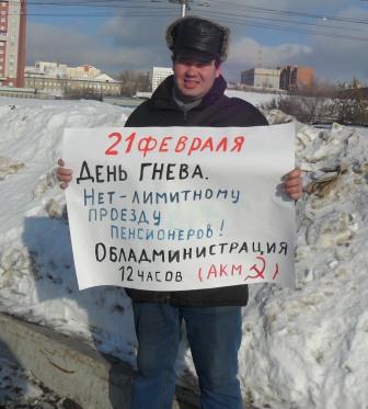 Сегодня, 12 февраля, в Новосибирске активисты АКМ и ЛФ провели одиночный пикет и раздачу листовок. 12 февраля – день общероссийской акции «День гнева», которую проводит внесистемная левая оппозиция. Поскольку в нашем городе организовать в этот день какую-либо акцию, достойную такого названия, не представлялось возможным, было решено считать «Днем Гнева» планируемый на 21 февраля митинг у обладминистрации против отмены безлимитного проезда «льготников» на общественном транспорте, а 12 февраля провести одиночный пикет для приглашения народа на этот митинг. Рядом со станцией метро «Речной Вокзал» один наш активист стоял с плакатом-приглашением на «День Гнева» 21 февраля, а другой раздавал листовки также с приглашением на митинг и с разъяснением нашей позиции по данной проблеме. Мероприятие прошло без происшествий. Читать и комментировать Комментариев: 0