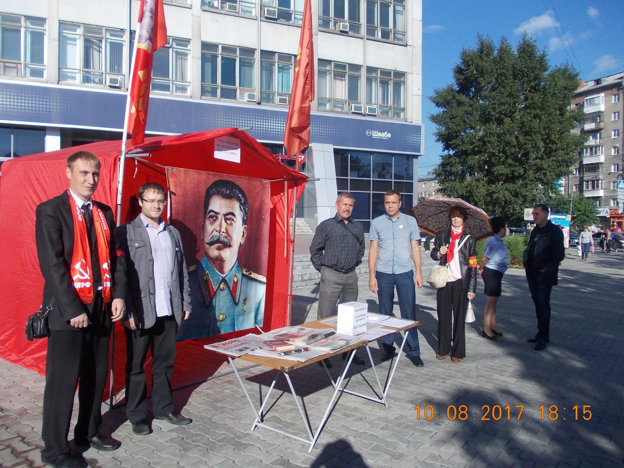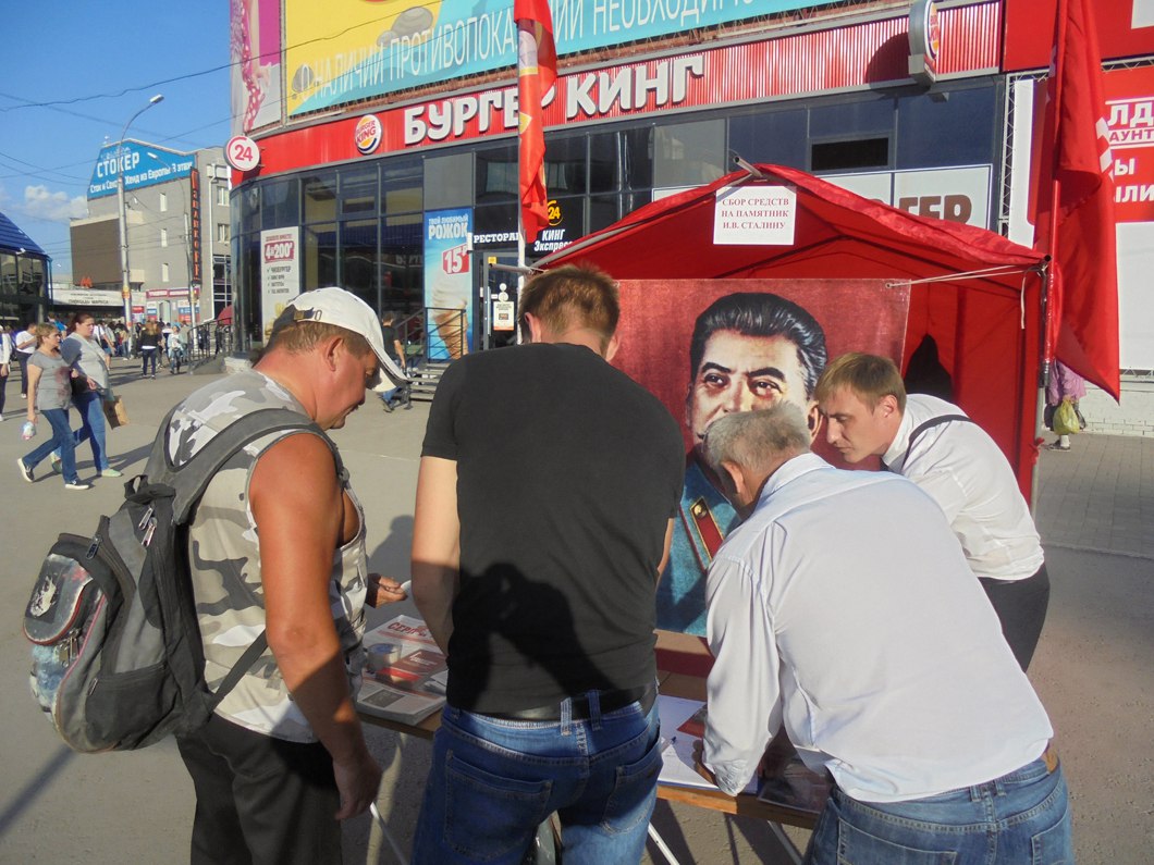 2017-08-11 18:12:11 Сталинский пикет 10 августа 10 августа на пл. Калинина состоялся очередной пикет по сбору средств на гранитный пьедестал для бюста Сталина в городе Новосибирске. За два часа собрали 1678 рублей 70 копеек. Вечером погода была солнечная, и люди активно подходили к нашей палатке, бросали в коробочку народные копеечки, фотографировали портрет Сталина. Следующий пикет состоится ровно через неделю – в четверг, 17 августа, на площади Маркса. Приходите и приводите своих друзей! Также вы можете внести средства на памятник Сталину на номер нашей карты в Сбербанке: 4276 4400 1012 2445 (получатель Денисюк Алексей Владимирович, тел. 8.923.775.09.05). Читать и комментировать Комментариев: 0