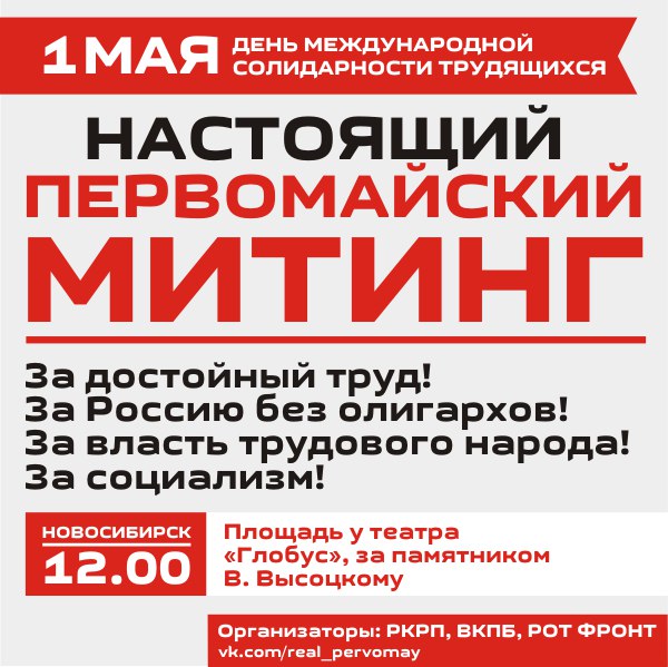 (К.Б.) Первое мая – День международной солидарности трудящихся, один из главных праздников для левых всего мира. Какие мероприятия в этот день будут проводить новосибирские коммунисты из РКРП?