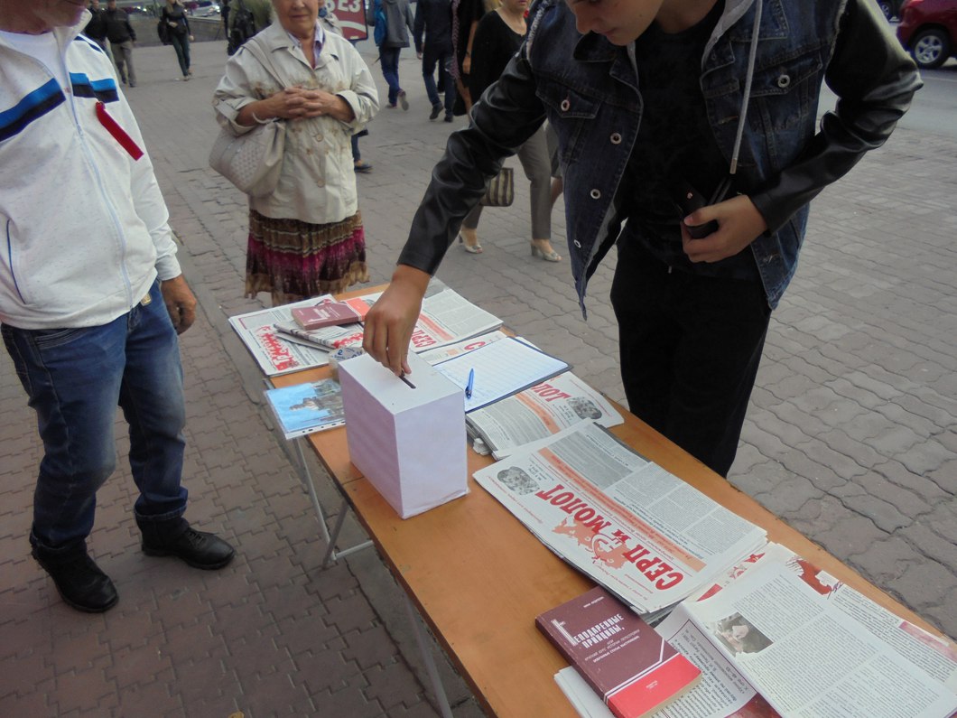 2016-09-01 18:14:49 КТО ПО 50, КТО ПО 100 РУБЛЕЙ Сегодня, 1 сентября, у Дома Ленина, состоялся очередной пикет по сбору подписей и средств на памятник И.В. Сталину в городе Новосибирске. Примечательно, что в этот раз на памятник Сталину вносили средства молодёжь – кто по 50, кто по 100 рублей. Клали свои копеечки в нашу коробочку. Конечно, за два часа собрали немного – 1 983 рублей. Следующий пикет состоится 8 сентября, в 17.00 – 19.00, там же, у Дома Ленина. Приходите и приводите своих друзей! Мы памятник поставим – на народные средства!