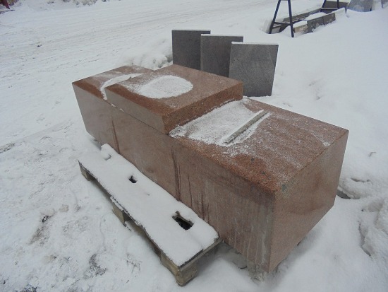 Год назад были собраны деньги на сам бюст, а недавно в город привезли постамент. Гранит: красный кордай, отполированный. Постамент состоит из трёх частей: стела размером 190х45х55 см. и две нижние тумбы размерами 10х53х63 и 18х100х120 см. Вес стелы: две тонны.