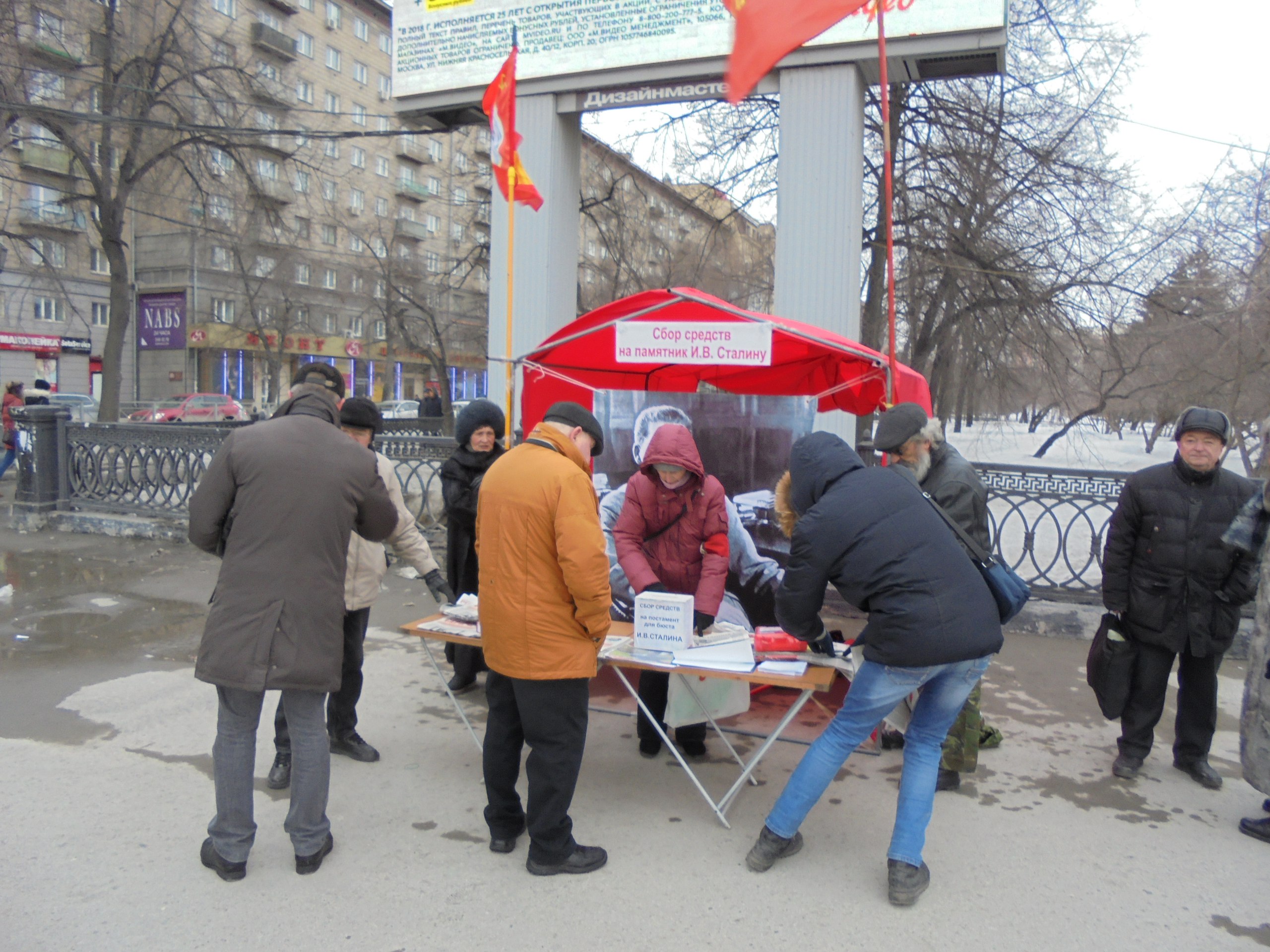 2018-03-20 20:36:48 В Новосибирске прошёл очередной пикет за памятник И.В. Сталину Сегодня 20 марта на пл. Ленина по инициативе ВКПБ совместно с РКРП и нашими сторонниками состоялся очередной пикет по сбору средств на памятник Сталину в городе Новосибирске. Погода была прохладная, но заявленные нами два часа мы отстояли и собрали неплохо – 2 450 руб.