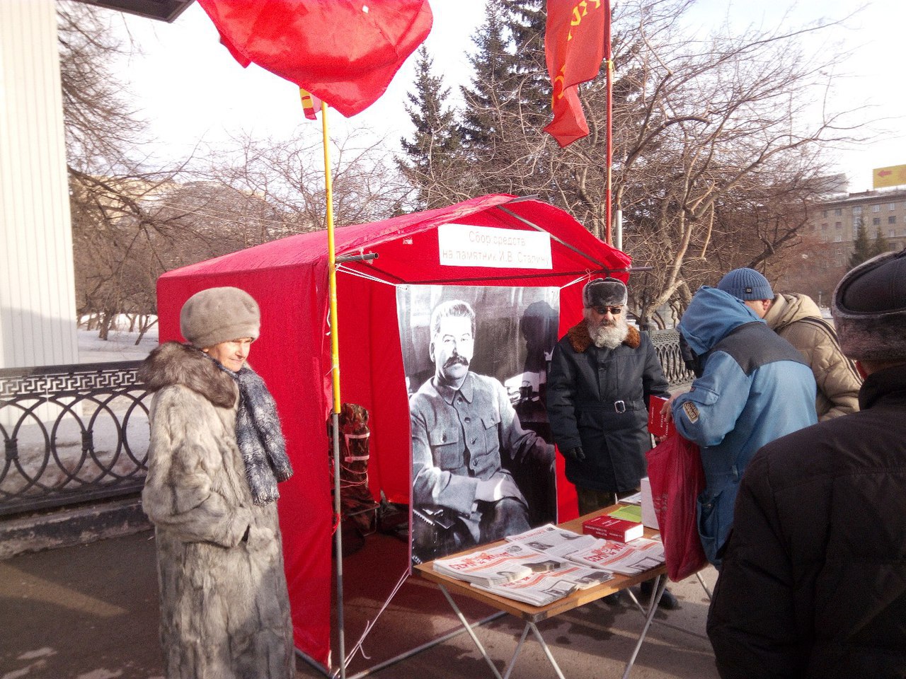 2018-03-29 17:05:02 В Новосибирске прошёл очередной пикет за памятник И.В. Сталину Сегодня 27 марта на пл. Ленина по инициативе ВКПБ совместно с РКРП и нашими сторонниками состоялся очередной пикет по сбору средств на памятник Сталину в городе Новосибирске. Был сильный ветер, даже сносило палатку, пришлось её держать. За два часа собрали – 1 950 руб.