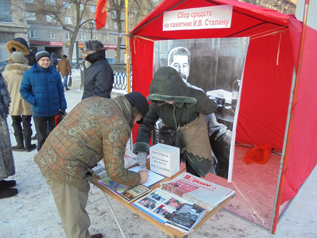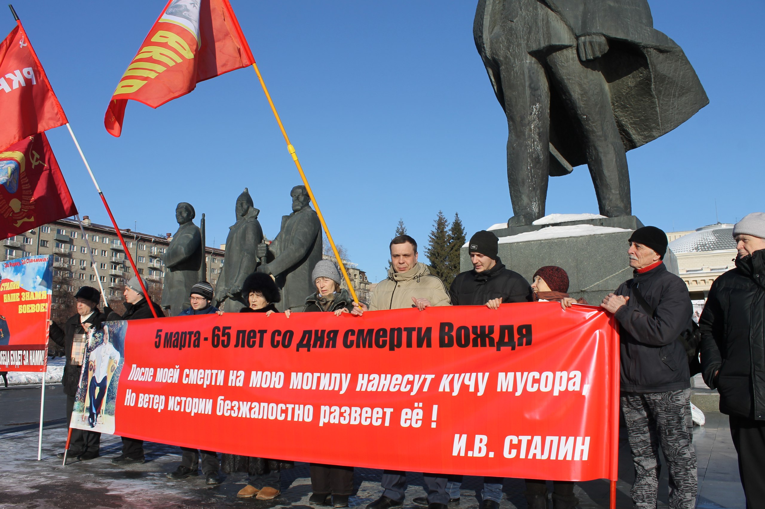 2018-02-28 06:26:43 Очередной пикет по сбору средств на памятник И.В. Сталину в Новосибирске 27 февраля на пл. Ленина по инициативе ВКПБ совместно с РКРП состоялся очередной пикет по сбору средств на гранитный пьедестал для бюста Сталина в городе Новосибирске. За два часа собрали очень даже хорошо – 7 700 руб.